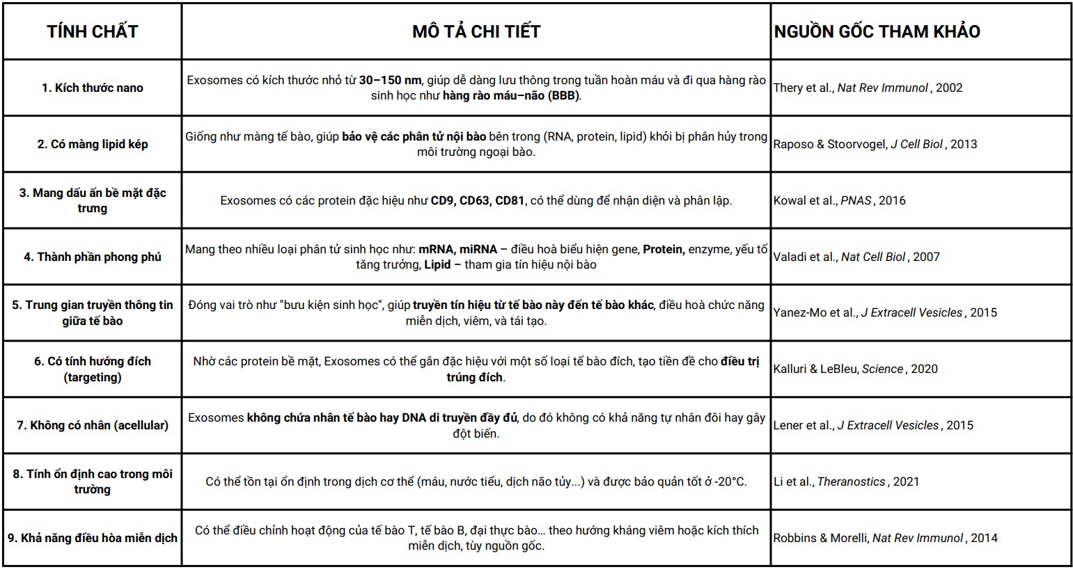 – Exosomes (túi ngoại bào): Là các túi lipid kép có đường kính khoảng 30-150 nanomet được tiết ra từ tế bào. Chúng chủ yếu được hình thành thông qua con đường nội thể và hiện diện trong các dịch cơ thể như máu và nước bọt. +Exosomes chứa các phân tử sinh học như protein, lipid, mRNA, miRNA và DNA, và đóng vai trò quan trọng trong giao tiếp giữa các tế bào.